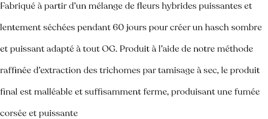 A premium line of proudly Quebecois hashish inspired by traditional Middle Eastern traditions. Malleable and smooth with an aroma that marries floral and spicy notes in perfect harmony.
